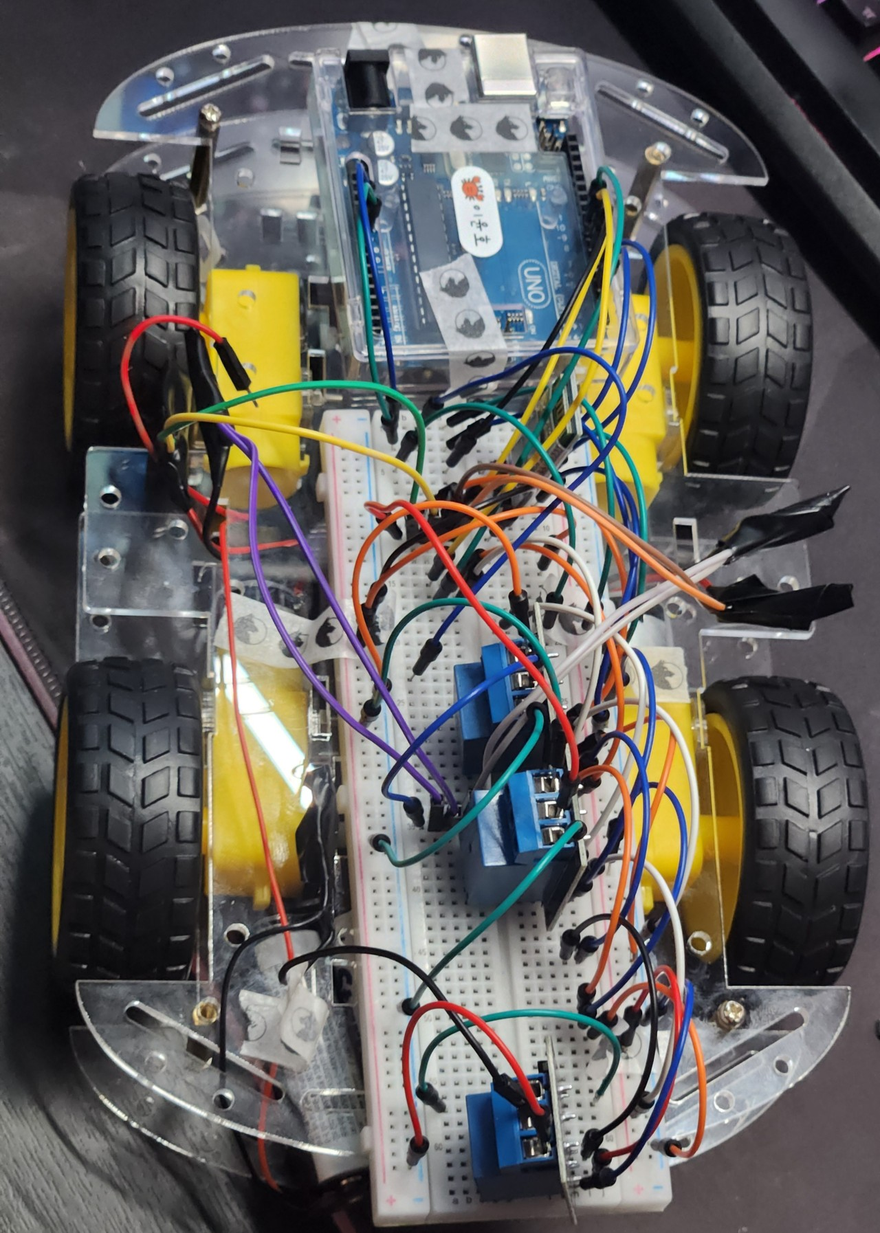 아두이노에서 출력되는 5V출력은 모터를 돌리기에 부족해 배터리팩을 따로 사용했다.