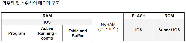 - 라우터와 스위치의 설정 파일 저장 : 라우터와 스위치의 설정 내용은 RAM에 저장되어 라우터의 전원이 꺼지거나 재부팅 되면 재설정해야 함. 설정 내용을 유지하기 위해서는 RAM에 있는 내용을 NVRAM으로 복사해야 함