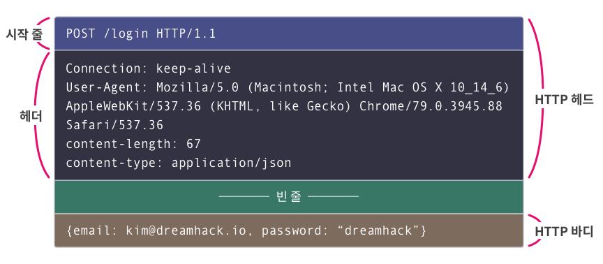 HTTP 헤드의 각 줄은 CRLF로 구분되며, 첫 줄은 시작 줄(Start-line), 나머지 줄은 헤더(Header)라고 부릅니다. 헤드의 끝은 CRLF 한 줄로 나타냅니다.