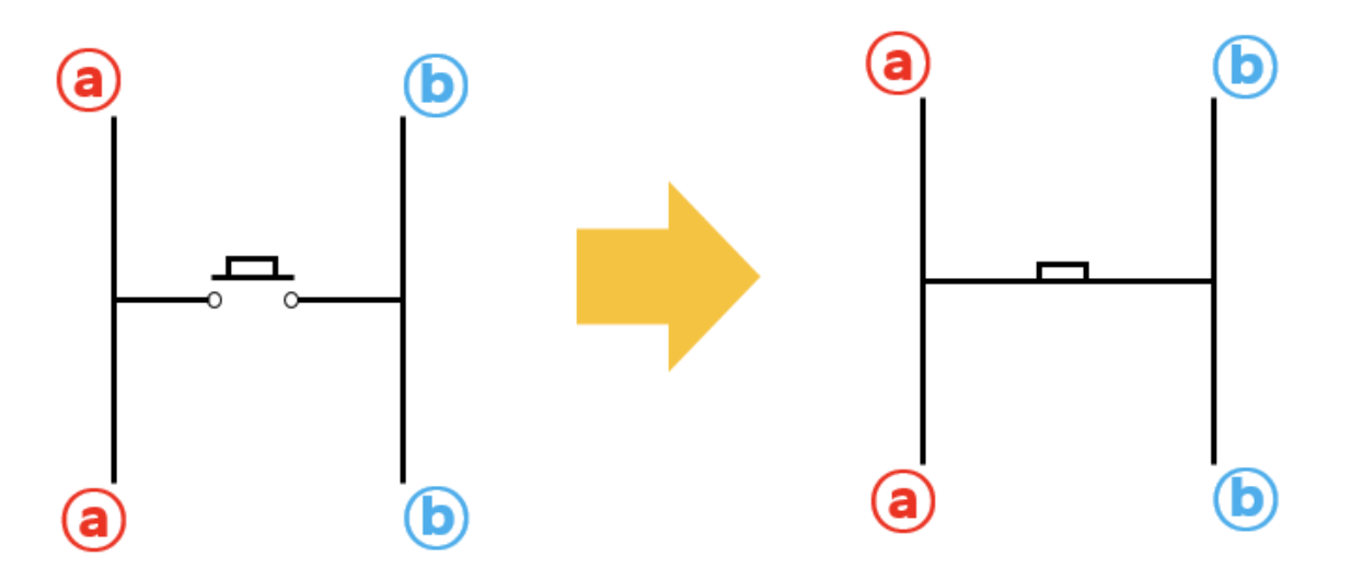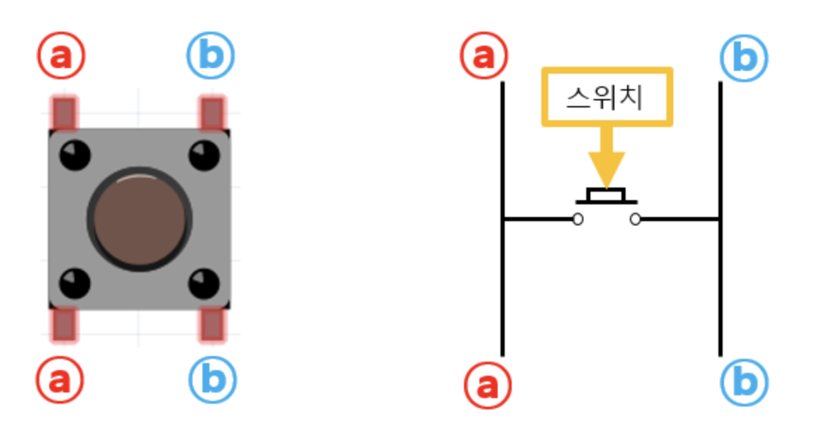 평소에는 a는 a끼리, b는 b끼리만 통전되다가, 스위치를 누르면 가운데가 연결되며 핀4개가 모두 통전되는 방식이다.