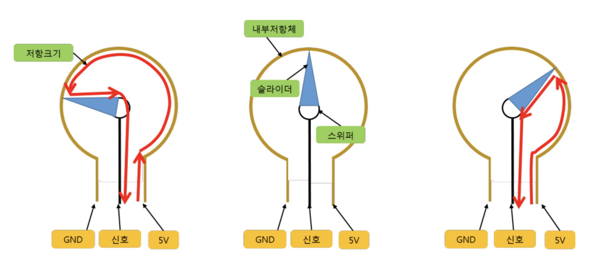 5V핀을 타고 올라간 전류는 가변저항 내부의 슬라이더를 타고 신호 역할을 하는 단자(A0)를 따라 내려가게 된다.