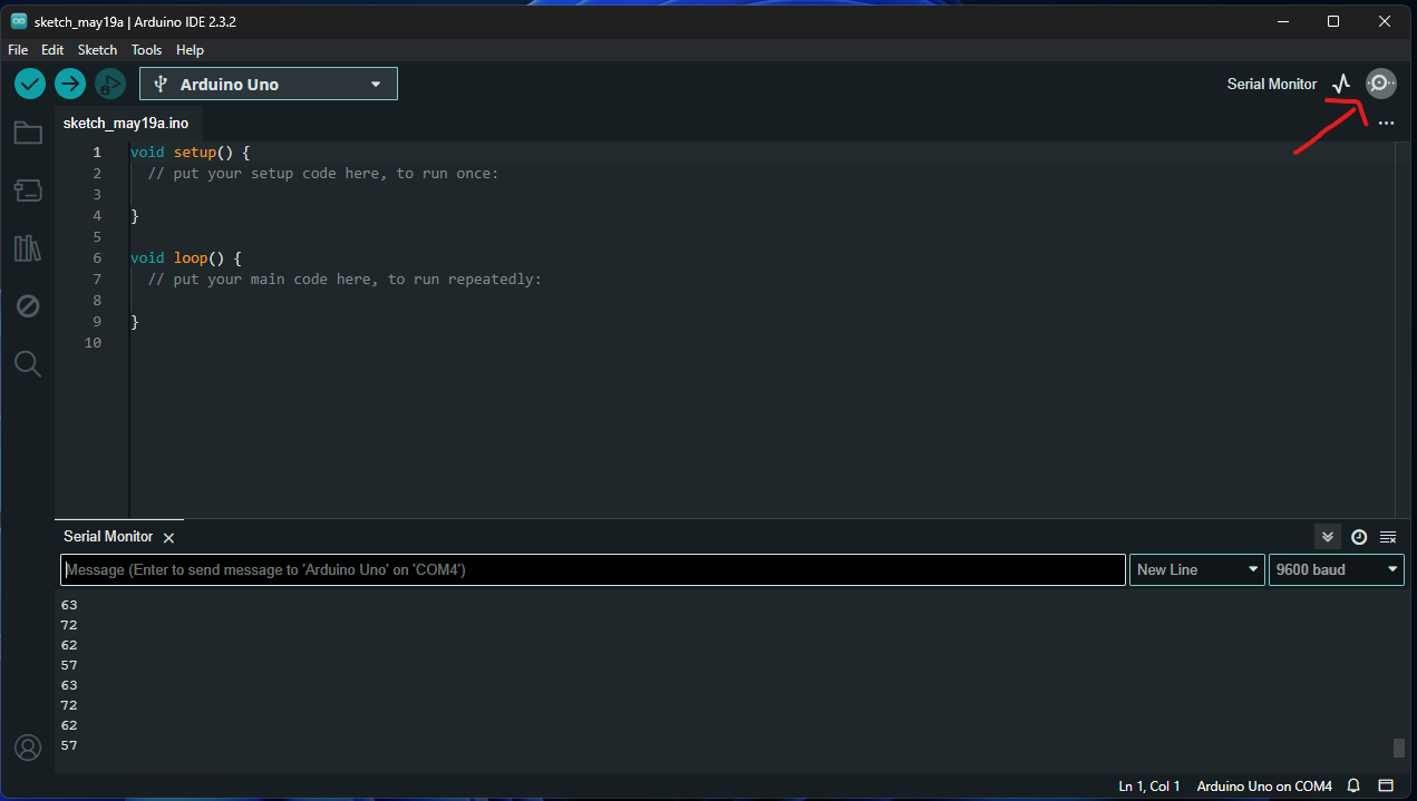 아두이노 IDE화면에서 우측상단에 돋보기 모양 아이콘을 클릭하면 시리얼 모니터를 켤 수 있다.