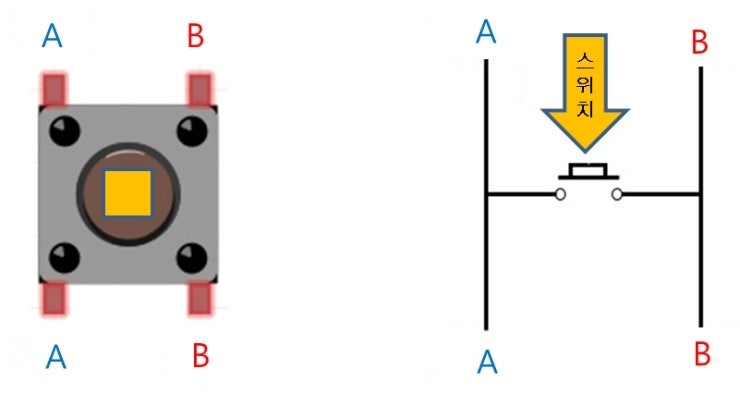택트 스위치의 회로도는 이렇게 생겼으며, 다음과 같이 회로를 구성하고 코드를 실행하면 스위치를 누를때만 LED가 켜지는것을 볼 수 있다.