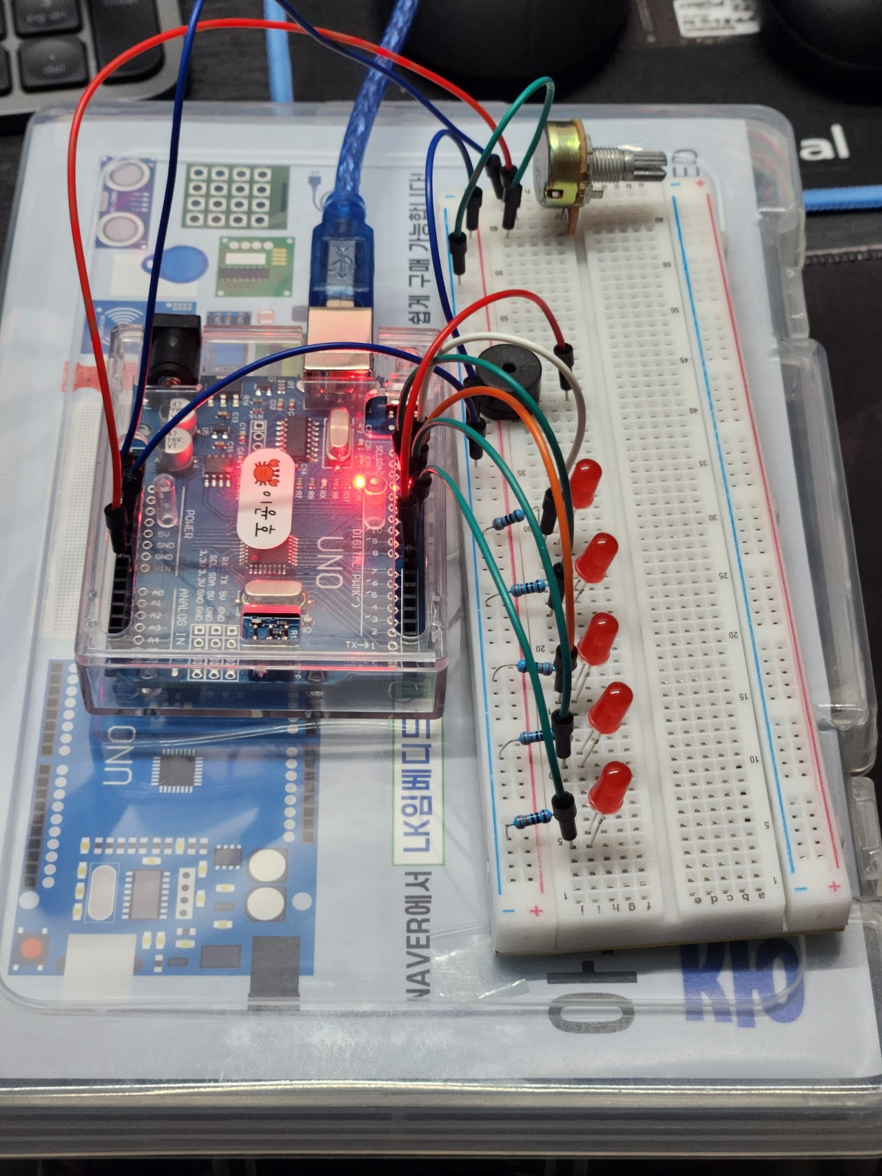 아래와같이 회로를 구성하고, 코드를 실행하면 스위퍼를 돌리는것에따라 0%는 아무 반응이 없고, 0%초과 20%이하는 LED 1개, 스피커에서는 도 가 출력된다.