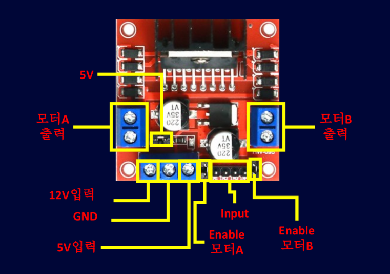 고용량 DC모터를 원활히 운전시키기 위한 부가장치이다. 특히 아두이노와 같은 마이크로컨드롤러로 제어하기 쉽게 구성되어 있어 회로를 구성하는 수고를 덜어준다. 모터드라이버는 아두이노로부터 HIGH 또는 LOW신호를 인가받아 DC모터의 회전 방향을 결정하고, PWM신호를 수신하여 모터의 회전력을 제어한다. 모터의 회전 방향은 모터 드라이버의 극성을 바꾸어 제어하고, 회전력은 PWM 신호로 모터에 유입되는 전력으로 제어한다.