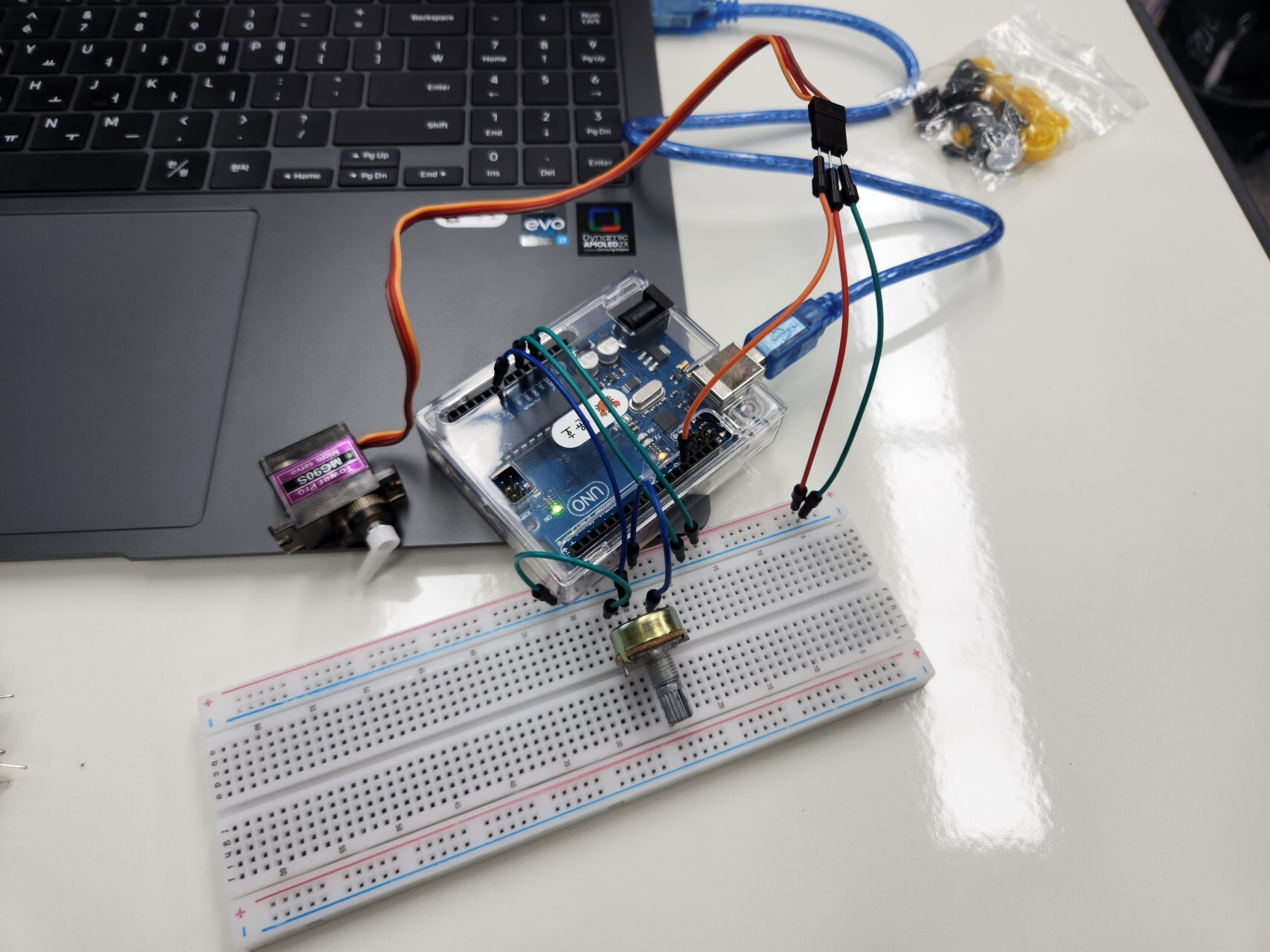 아래와같이 회로를 구성하고, 코드를 실행하면 가변저항을 돌리는것에따라 서보모터의 각도도 조절되는것을 볼 수 있다.