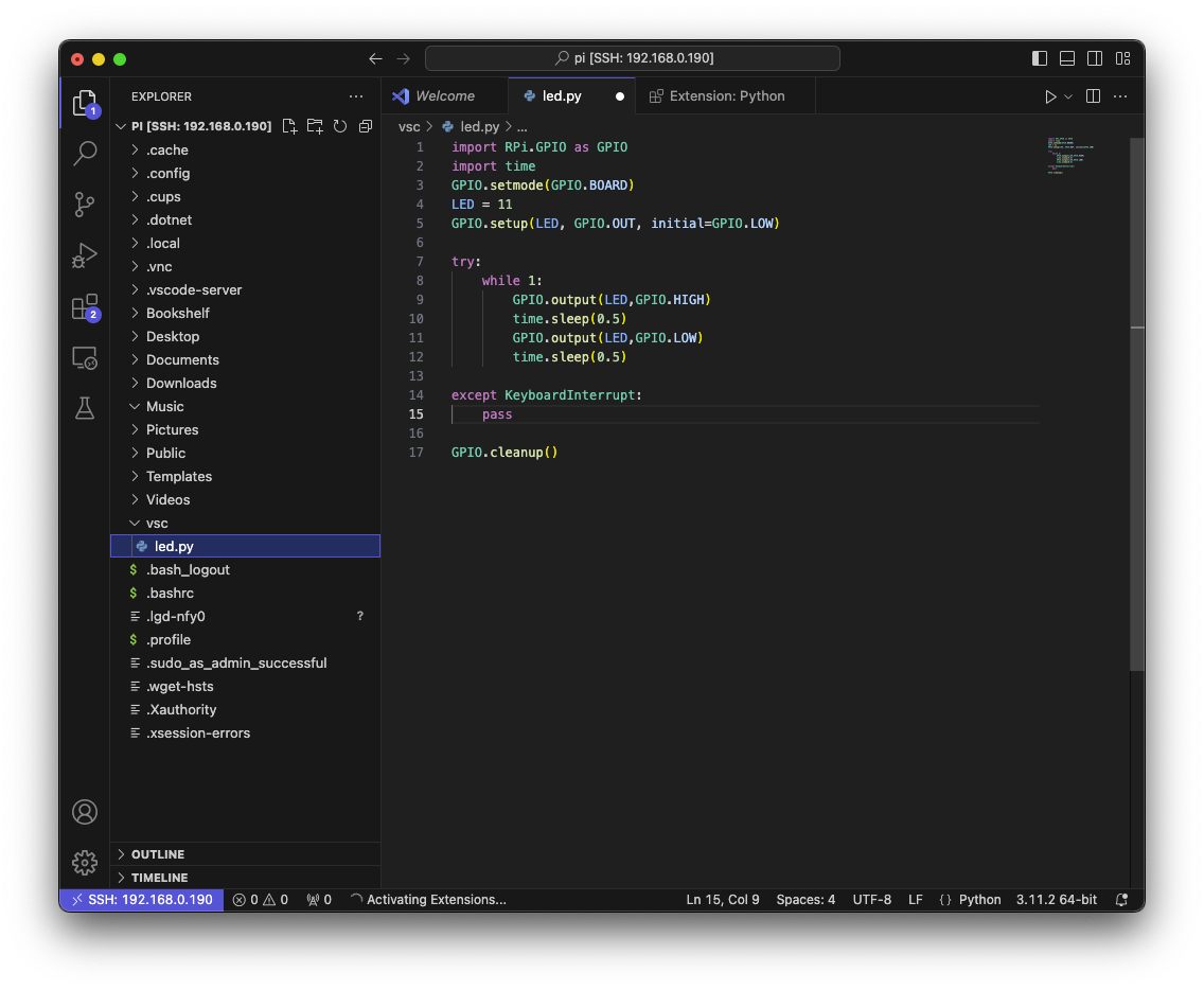 Raspberry Pi에 VSC로 원격 연결하고, 다음 코드를 실행한다. (Python 코드 실행을 위해 Raspberry pi에 python extension 설치가 필요할 수도 있다.)