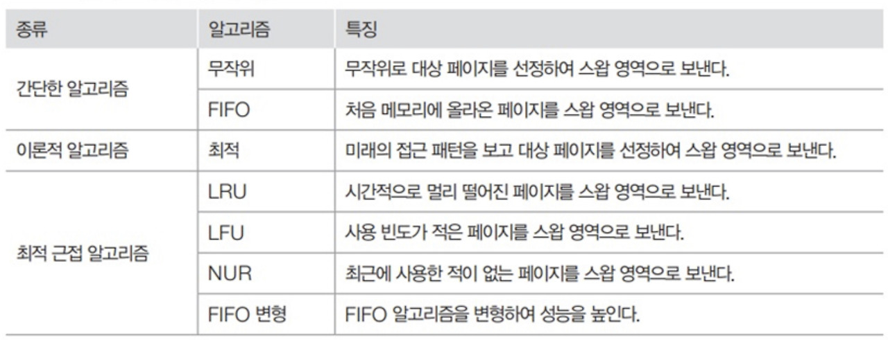 페이지 교체 알고리즘의 핵심은 메모리에서 앞으로 사용할 가능성이 적은 페이지를 대상 페이지로 선정하여 페이지 부재를 줄이고 시스템의 성능을 향상하는 것이다. 따라서, 이에 대한 구현 방식에 따라 아래와 같은 여러 종류의 페이지 교체 알고리즘이 만들어졌다.