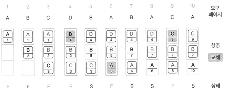 시간상으로 물리 메모리에 가장 먼저 들어온 페이지를 대상 페이지로 선정하여 스왑 아웃시킨다. 페이지 부재일 때는 F, 원하는 페이지가 메모리에 있는 경우는 S로 표시되어 있다.