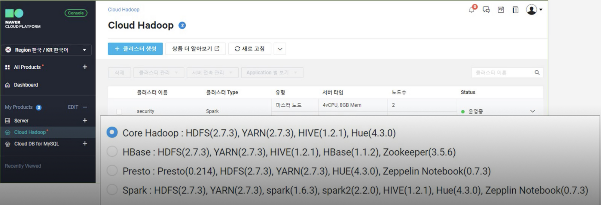 - Apache Ambari를 기본 제공하여 하둡 클러스터의 관리 및 모니터링에 효율적