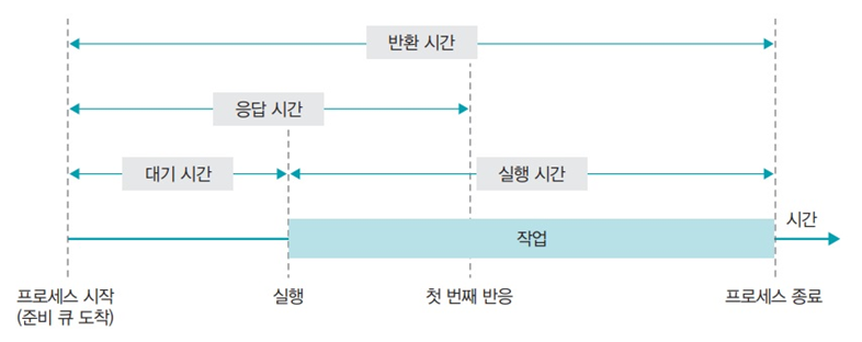 | 반환 시간 | 작업을 완료하는데 소요되는 전체 시간으로 대기 시간과 실행 시간을 모두 포함합니다. |