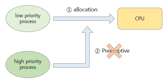 한 번 CPU를 할당 받은 프로세스는 작업이 종료될 때까지 CPU를 독점한다. 해당 프로세슥 종료되기 전까지는 다른 프로세스가 CPU를 사용할 수 없다.