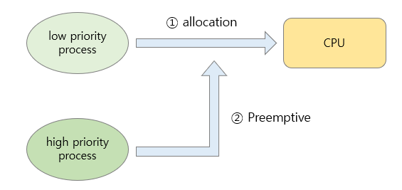 프로세스A가 CPU를 사용하고 있더라도, 그것보다 우선순위가 높은 프로세스B가 CPU를 뺏을 수 있다. 즉, 기존 프로세스를 중단시켜 CPU를 반납하게 한 후, 우선순위가 높은 프로세스가 CPU를 할당 받아 수행될 수 있다. 이때 문맥 교환이 발생한다.
