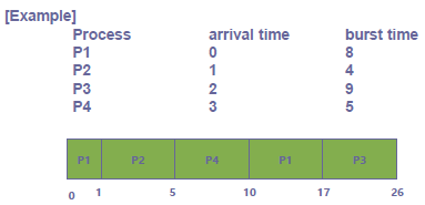 SRTF는 잔여 CPU burst가 가장 적은 프로세스를 선택한다. SRTF는 SJF의 preemptive version이다. 프로세스의 Ready Queue에는 도착시간이 명시되어야 한다. 프로세스 수행중 다른게 Ready Queue에 들어오면 잔여시간을 계산하여 어떤 것을 먼저 수행할지 결정한다.