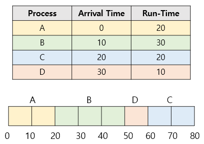 1) 항상 짧은 작업을 먼저 처리하게 되니까 평균 대기시간이 가장 짧습니다.
