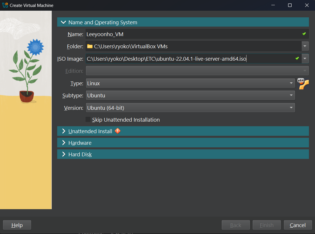 Name에 VM 이름을 적고, ISO Image에 아까 다운받은 Ubuntu ISO 파일을 불러온다.